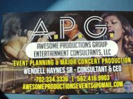 We started Awesome Productions Group in 1994 with a simple goal in mind: to create a platform designed to serve as a one stop shop for producing Major Concerts & Events of all kinds..We have produced and serviced more than 3,000 Concerts, 87 Films, 300 TV Productions, 11 UFC Broadcast, 600 City Festivals 63 Theatrical Plays and thousands of Corporate and Private Events .We handle every aspect of your production so you don't have too We will contract with Venues and Entertainers on your behalf and handle all 56 steps required for any event. This means we take care of Insurance Requirements, Police & or Security Contracts, Licensing, Entertainment Permits, Alcohol Permits, Vendor Contracts, lighting, Sound, Video, Major Artist Contracts, Produce Radio & TV Commercials and One call is all it takes. (702) 334-3336 Nation Wide & Abroad.